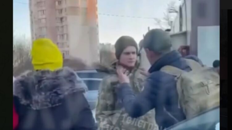 Одна з жінок трясла службовця ТЦК за комір, а військовий, що підійшов, відібрав у нього посвідчення - за те, що мобілізують людей "по беззаконню".