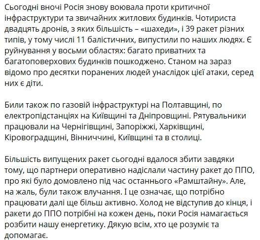"Сьогодні вночі Росія знову воювала проти критичної інфраструктури та звичайних житлових будинків. Чотириста двадцять дронів, більшість з яких - "Шахеди", та 39 ракет різних типів, у тому числі 11 балістичних, випустили за нашими людьми", - написав Зеленський.