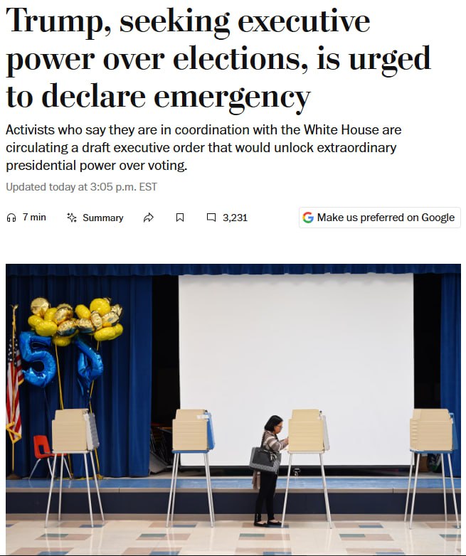 Видання пише, що активісти, які підтримують Трампа і стверджують, що діють у координації з Білим домом, поширюють 17-сторінковий проект виконавчого указу, в якому стверджується, що Китай втрутився у вибори 2020 року, що є підставою для оголошення надзвичайного стану в країні, яке відкриє президентові надзвичайні повноваження.