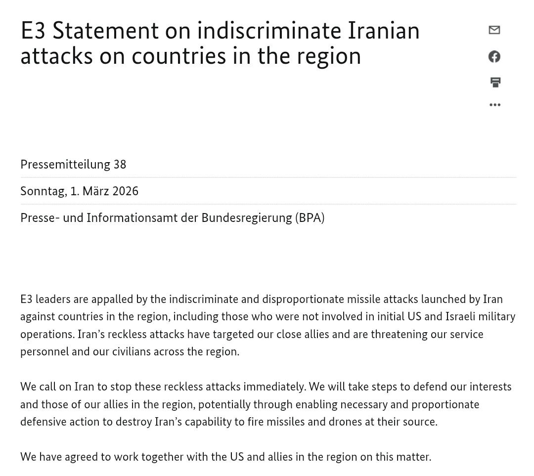 Раніше Франція, Німеччина та Великобританія відхрестилися від нападу США та Ізраїлю на Іран, заявивши, що не беруть участі в ударах по ісламській республіці, і закликали до відновлення переговорів.