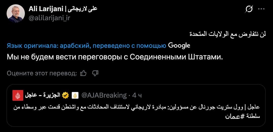 Він перепостиг повідомлення Wall Street Journal про те, що Ларіджані передав США пропозицію про переговори через Оман.