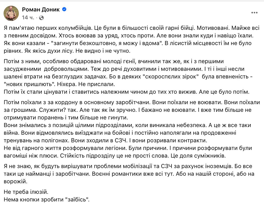 Вони поїхали не воювати. Вони поїхали за грошима. Служити? Так. Але так, як їм зручно. І бажано не воювати. І вже тим більше не отримувати поранення, і тим більше не гинути. Вони знімалися з позицій цілими підрозділами, коли виникала небезпека. А це таки війна. Вони відмовлялися виїжджати на бойові та постійно наполягали на продовженні тренувань на полігонах. Вони йшли у СЗЧ. І вони розривали контракти. Чи не від хорошого життя розформували легіони. Були причини", – написав Донік.