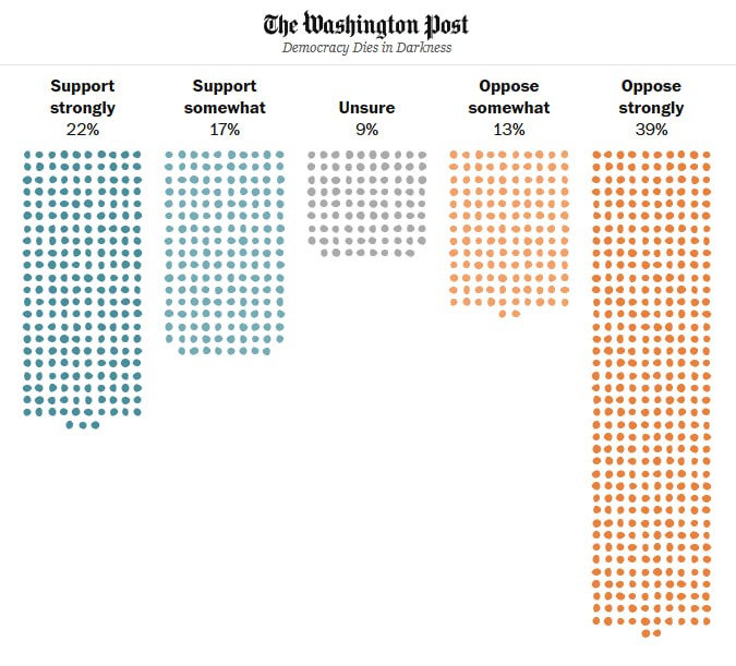 При цьому рівень підтримки серед республіканців становить 81% (12% проти), серед демократів – 9% (87% проти).