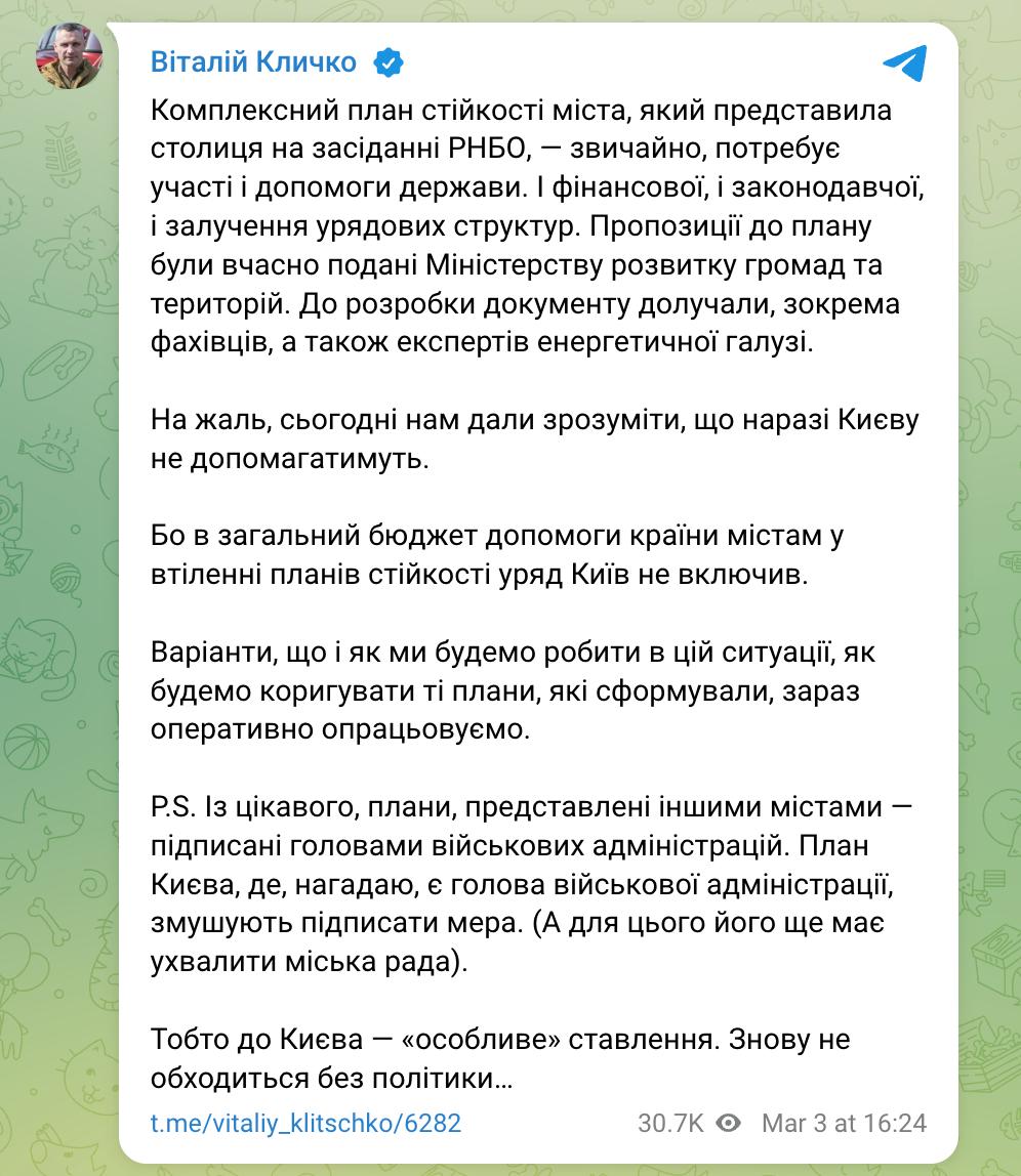 "На жаль, сьогодні нам дали зрозуміти, що Києву поки не допомагатимуть. Тому що до загального бюджету допомоги країни містам у реалізації планів стійкості уряд Київ не включив", - заявив Кличко.