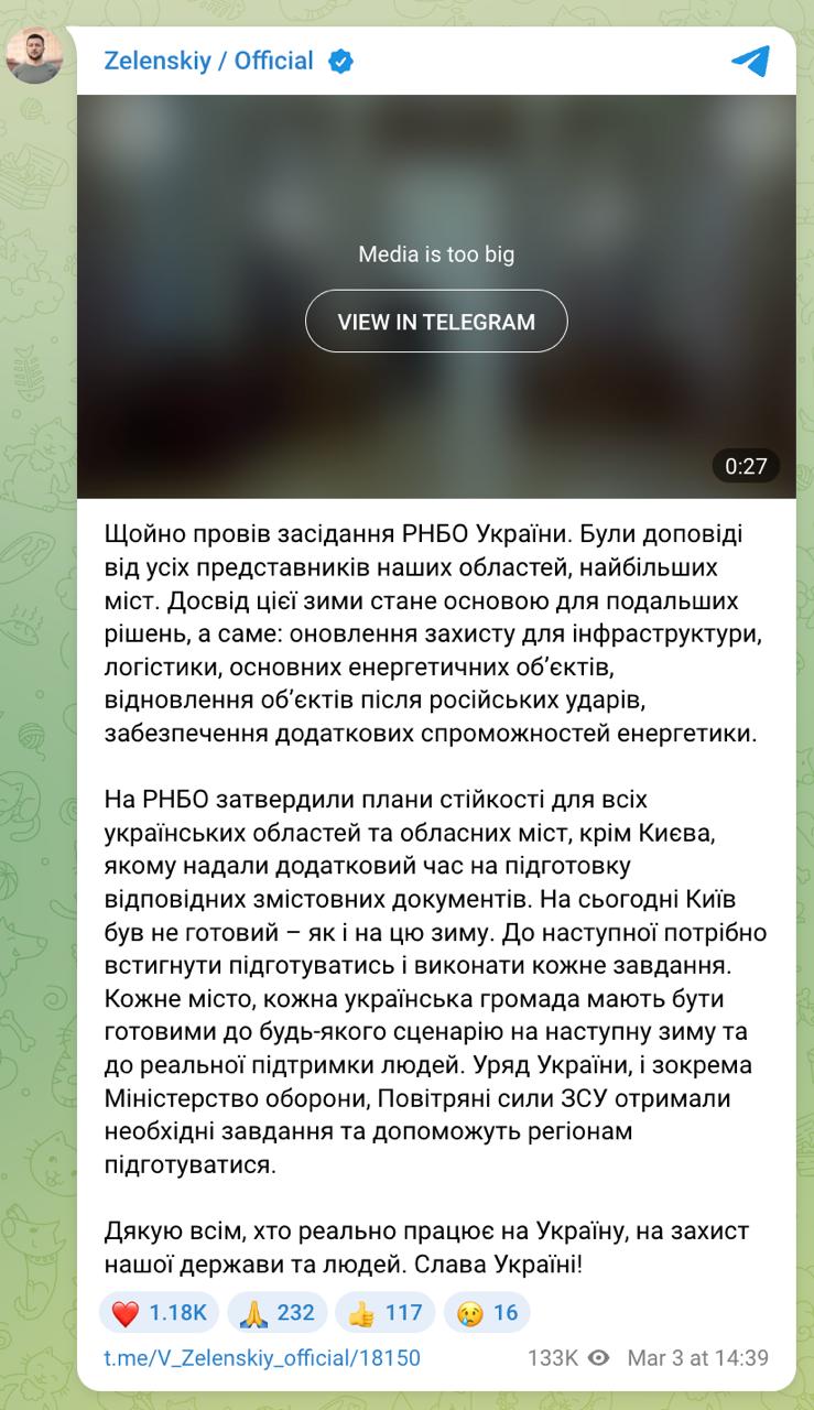 "Києву надали додатковий час на підготовку відповідних змістовних документів. На сьогоднішній день Київ був не готовий - як і на цю зиму. До наступної треба встигнути підготуватися та виконати кожне завдання", - написав президент.